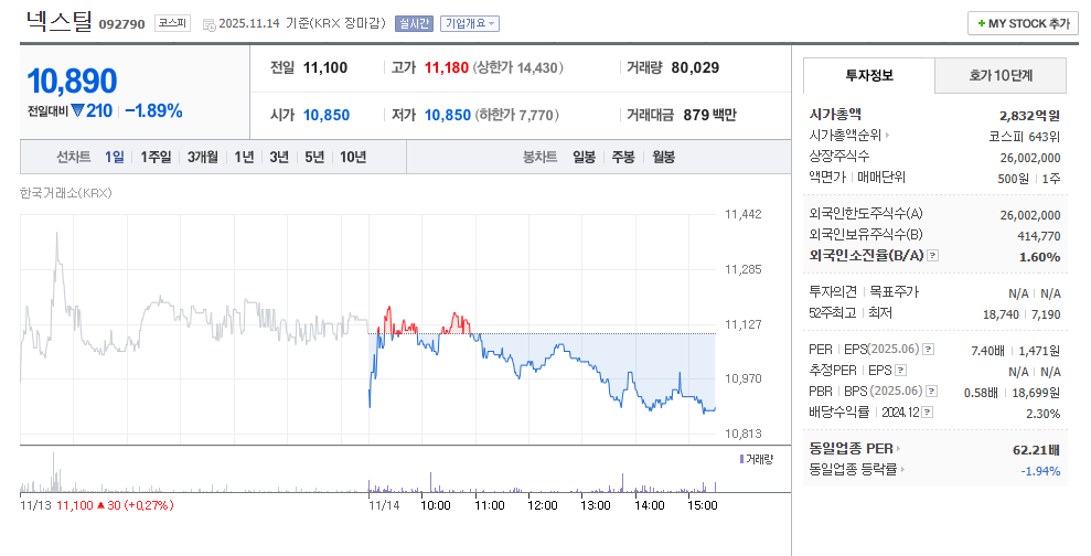 최근 넥스틸의 주가는 큰 상승이 나온 이후 다시 장기 박스권을 만들어가는 모습에 가까워 보입니다. 단기적으로는 변동성이 조금 있는 편이지만, 전체적인 가격대는 과하게 고평가되어 있지는 않은 구간입니다. 특히 최근 분기 실적이 안정적으로 유지되고 있어 기업 가치 대비 가격 부담이 극단적으로 큰 편은 아닙니다.