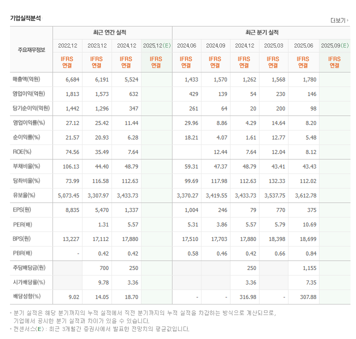 2024년 9월 분기 실적만 보더라도 매출 1,570억 원, 영업이익 139억 원을 기록하며, 이익을 안정적으로 유지하는 모습을 확인할 수 있습니다. 게다가 유보율도 3,300% 이상으로 매우 높아 재무 건전성이 탁월하다는 점도 투자 매력 요소 중 하나입니다.