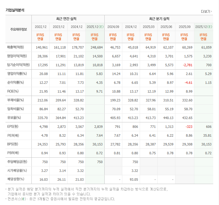 하지만 다행히도 당사의 **수익성**은 견조합니다. 2025년 12월 연간 매출액은 24조 원대, 영업이익은 1조 4천억 원대로 전망됩니다. 특히 최근 분기(25.09)에 일시적인 순손실(-278억 원)이 발생했음에도, 곧바로 연말에 흑자 회복이 예상될 정도로 **사업의 기초 체력이 탄탄**합니다.