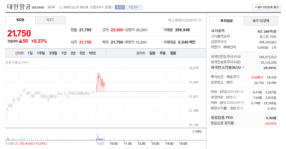 - **③ 높은 외국인 신뢰도:** 외국인 투자자 소진율이 29.94%에 달합니다. 이는 글로벌 투자자들이 대한항공의 **회복 가능성과 자산 가치**를 높게 평가하고 있음을 보여주는 간접적인 증거입니다.