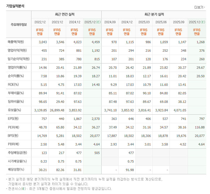 - **① 숨겨진 현금 파워 (높은 유보율):** 2024년 12월 기준 유보율은 **3,853%**가 넘습니다. 이는 회사가 설립 이후 벌어들인 이익을 자본금 대비 **수십 배 이상** 사내에 쌓아두고 있다는 의미입니다. 향후 대규모 투자, 인수합병(M&A), 혹은 주주 환원 정책을 펼칠 수 있는 **엄청난 현금 동원력과 재무적 유연성**을 보유하고 있습니다.