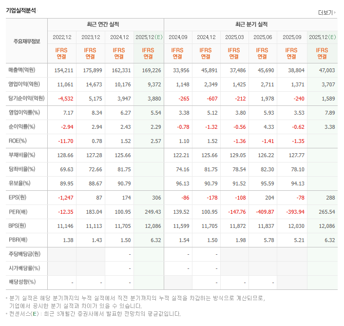- **낮은 유보율 (94.13%):** 유보율은 2025년 9월 기준 94.13%로, 이는 회사가 벌어들인 이익을 사내에 충분히 쌓아두지 못하고 있음을 의미합니다. 부채가 있는 상황에서 유보율마저 낮다는 것은, **예기치 않은 경기 침체나 대규모 투자 지연이 발생할 경우 재무적 유연성이 떨어진다**는 중대한 리스크를 내포하고 있습니다.