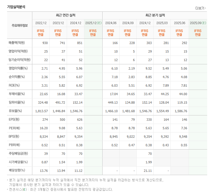 또한 부채비율은 약 44% 내외로 중소형 제조업체 기준 상당히 안정적인 수준이며, 유보율도 1,500% 내외로 매우 높아 장기적 투자나 설비 증설에도 부담이 거의 없는 구조를 가지고 있습니다. 회사의 현금흐름이 안정적이기 때문에 재무적인 리스크는 제한적이라고 볼 수 있습니다.