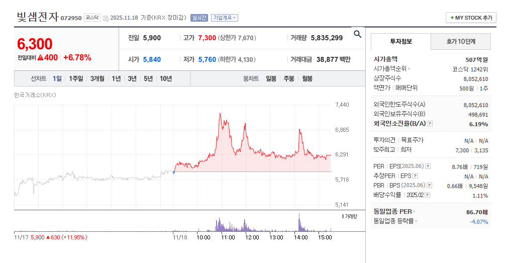 2025년 11월 18일 기준 빛샘전자의 종가는 6,300원으로 전일 대비 6.78% 상승했습니다. 장 초반부터 거래량 증가가 확연히 나타났고, 단기 매수세가 집중되면서 7,300원까지 급등하는 모습도 보였습니다. 이후 차익 실현 매물로 인해 가격이 일부 조정을 받았지만 단기적인 모멘텀은 여전히 유효한 흐름입니다.