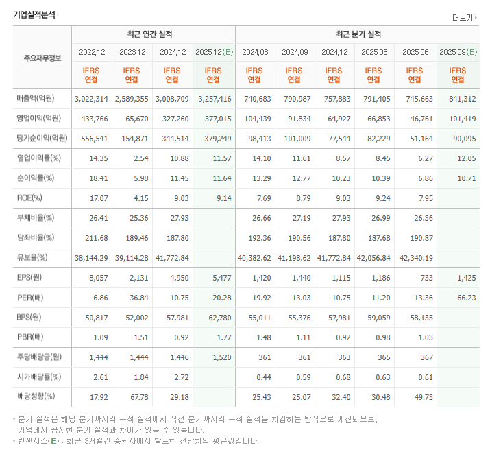2025년 삼성전자의 매출은 약 300조 원, 영업이익은 약 40조 원 수준으로 추정됩니다. 이는 전년 대비 뚜렷한 개선세를 보인 결과로, 메모리 단가 회복과 AI용 반도체 수요 확대로 설명할 수 있습니다. 다만 실적은 글로벌 경기와 IT 투자 흐름에 영향을 받기 때문에 외부 환경의 변화가 반영될 수 있습니다. 부채비율은 30% 내외로 안정적이며, 현금성 자산이 풍부해 미래 투자 여력이 충분한 상태입니다. 삼성전자는 매년 매출의 약 8~9%를 연구개발비로 투입하고 있으며, 이는 세계 최고 수준의 기술 경쟁력 유지에 기여하고 있습니다.