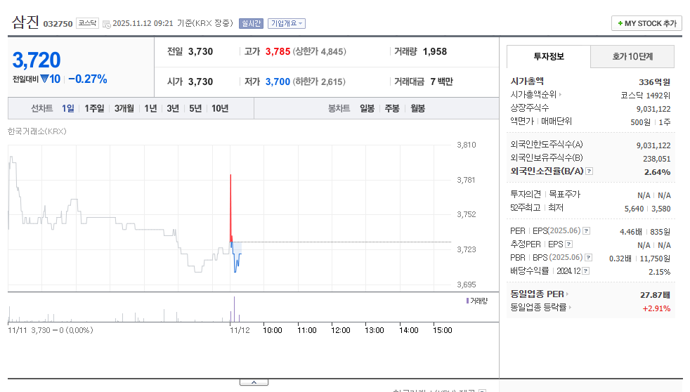 PER 4.4배, PBR 0.3배 수준의 밸류에이션은 시장 평균보다 낮습니다. 이는 실적 대비 주가가 저평가되어 있다는 뜻으로, 배당금까지 고려하면 장기 가치주로 평가할 만합니다. 삼진은 변동성이 크지 않은 대신 배당을 꾸준히 지급해왔고, 현금흐름 역시 안정적이라 중장기 관점의 투자자에게 적합한 종목입니다.