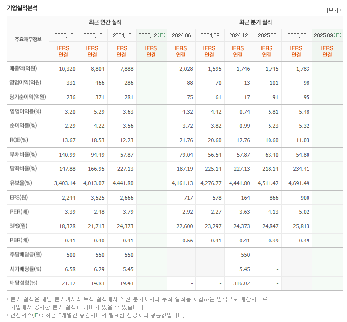 - • **낮은 부채:** 2024년 말 기준으로 부채비율은 57.87% 수준으로, 동종 업계와 비교했을 때 빚이 적고 재무적으로 안정적입니다.