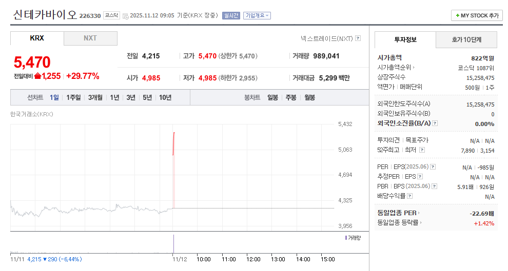 2025년 11월 12일, 오늘 아침 장이 열리자마자 5분 만에 상한가를 기록한 종목이 있습니다. 바로 신테카바이오(226330)입니다. AI 신약개발 테마의 대표 기업으로 불리지만, 이번 급등을 보며 저는 오히려 ‘지금은 들어가기 어렵다’는 판단을 했습니다. 이유는 단순합니다. 주가는 빠르게 움직이지만, 실적은 아직 따라오지 못하고 있기 때문이에요.