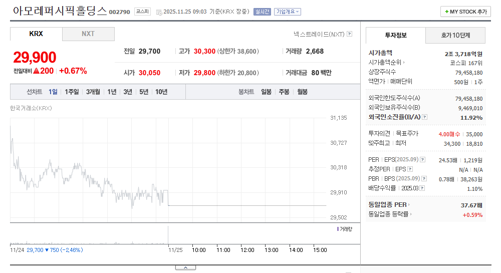 아모레퍼시픽홀딩스는 국내외 화장품 시장을 기반으로 하는 자회사를 통해 안정적인 사업 구조를 갖추고 있으나, **자회사의 실적 변동성**에 취약한 점을 투자 리스크로 고려해야 합니다. 그러나 **0.79 수준의 낮은 PBR**은 자산 가치 측면에서 충분한 안전 마진을 제공할 수 있는 매력적인 요소로 판단됩니다.