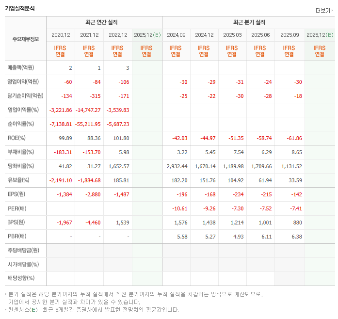 - **지속적인 영업 손실:** 매출액은 연간 1~3억 원대로 매우 낮고, 영업이익과 순이익은 연구개발(R&D) 비용 지출로 인해 **지속적으로 마이너스(손실)**를 기록하고 있습니다. 이는 바이오 기업의 구조적인 특징이며, 당분간 적자는 지속될 것입니다.