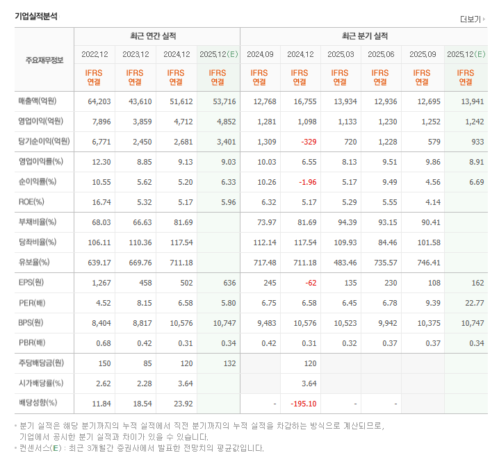 PER은 약 5~6배, PBR은 약 0.3배 수준으로, 동종 업종 대비 매우 저평가된 상태입니다. 해운업 특유의 경기 민감성을 고려하더라도 PBR 0.3배는 ‘자산가치 대비 할인 폭이 크다’고 볼 수 있습니다.
