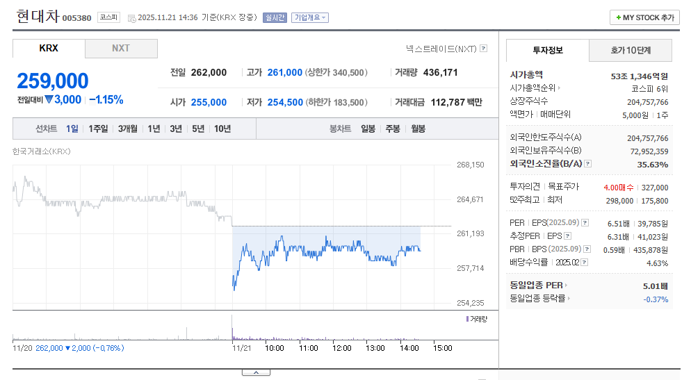 2025년 11월 21일 기준 현대차의 주가는 259,000원으로 전일 대비 소폭 하락했습니다. 최근 시장 전체가 약세를 보인 가운데, 외국인 수급이 감소하며 단기적으로 흔들렸습니다. 그러나 시가총액 기준 코스피 6위권의 대형주답게 급격한 변동보다는 완만한 흐름을 유지하는 모습입니다.