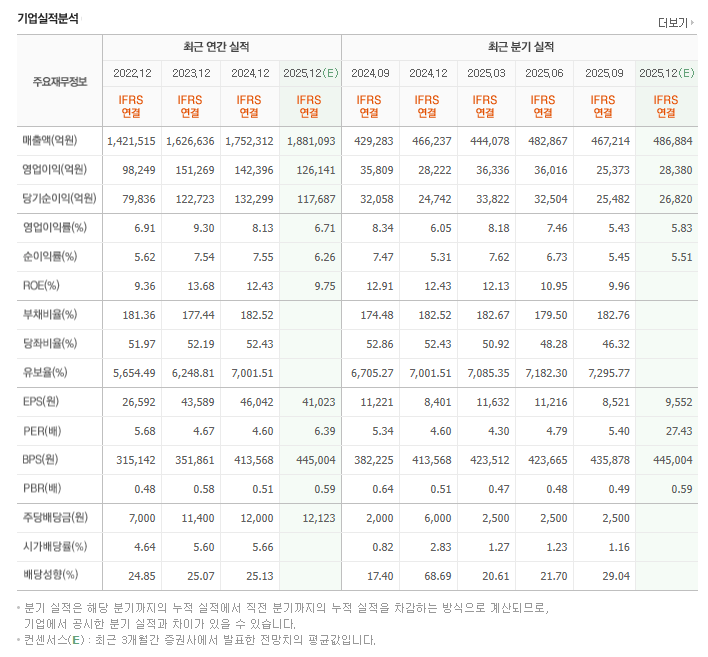 영업이익은 2022년 9.8조 → 2023년 15.1조 → 2024년 12.6조 수준이며, 2025년 예상치는 약 12.9조입니다. 전기차 경쟁 심화에 따른 ASP 하락과 판촉비 증가에도 상당히 견조한 수준입니다.
