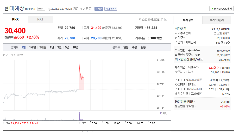 현대해상은 68년 전통의 안정적인 시장 지위와 미래를 위한 디지털 혁신 의지를 바탕으로 꾸준히 이익을 내는 우량 기업입니다. **높은 배당수익률**과 **자산 대비 저평가 매력**은 현재 시점에서 주목할 만한 핵심 투자 포인트입니다.