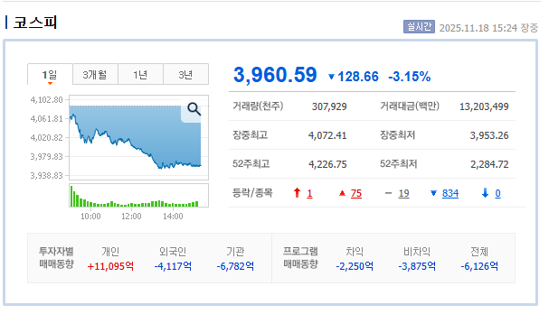 2025년 11월 18일 국내 증시는 글로벌 기술주 조정 여파와 기관·외국인의 동반 매도로 인해 전반적인 약세 흐름을 보였습니다. 코스피와 코스닥 모두 큰 폭으로 하락하며 투자심리가 위축된 하루였습니다. 오늘 시장은 지수, 산업별 흐름, 주요 이슈 등 전반적인 면에서 조정 압력이 강하게 나타났습니다.