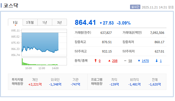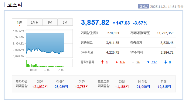 11월 21일 국내 증시는 전반적으로 강한 하락세를 보이며 투자심리가 크게 위축된 하루였습니다. 코스피는 -3.61%, 코스닥은 -3.12%, 코스피200은 -4.00%의 낙폭을 기록하며 주요 지수가 거의 동반 투매에 가까운 움직임을 보였습니다. 장 초반부터 하락 압력이 강했고, 오후 들어 반등 시도가 있었지만 제한적인 모습이었습니다.