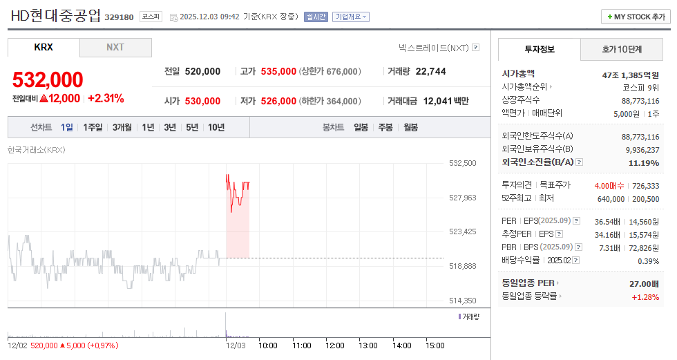 - **재무 건전성:** 부채비율은 239.93%로 중공업 특성상 높은 편이지만, 안정적인 수준에서 관리되고 있으며, 유보율(993.74%) 역시 안정적인 재무 기반을 뒷받침하고 있습니다.