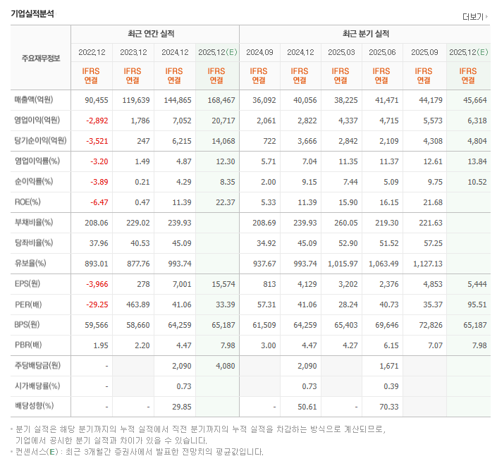 - **압도적인 영업이익 회복:** 2024년 12월 기준 영업이익 1조 6천억 원을 기록하며 흑자로 전환했고, 2025년에도 매출액 16조 원대, 영업이익 1조 7천억 원대로 꾸준한 성장이 예상됩니다.