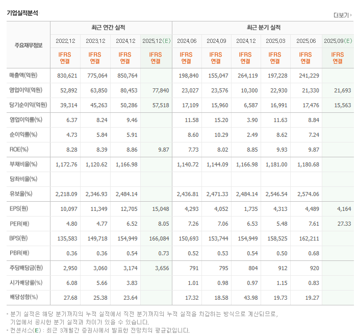 • 영업이익: 연간 약 7조~8조 원대 수준을 꾸준히 유지