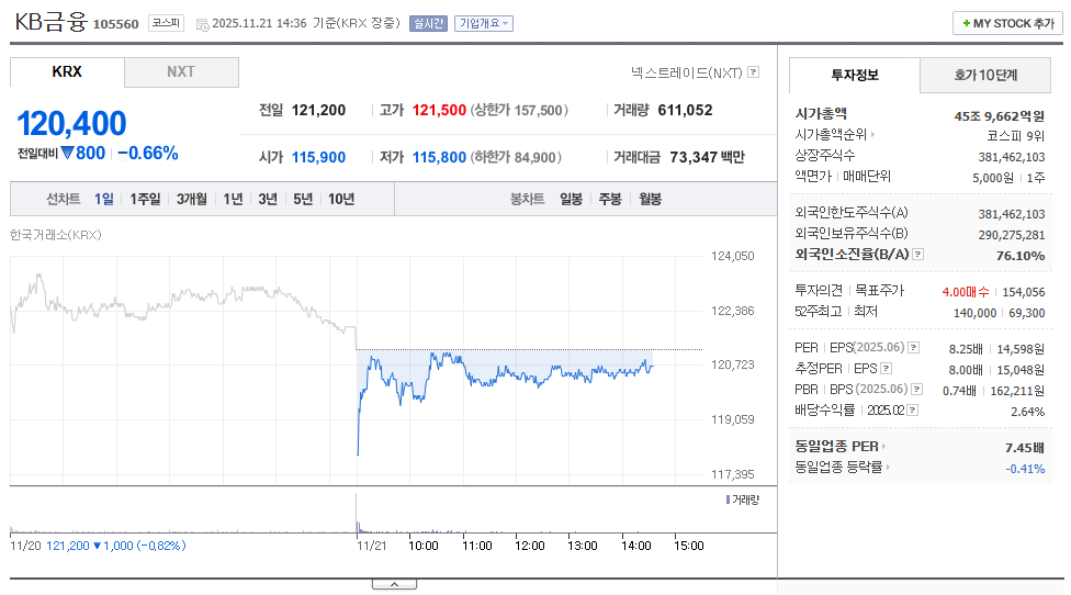 최근 KB금융은 변동성 장세 속에서도 비교적 견고한 흐름을 유지하고 있습니다. 11월 21일 기준 주가는 12만 400원, 전일 대비 -0.66% 하락했으며 장중 11만 5,800원까지 밀렸다가 일부 회복하는 모습을 보였습니다. 금융주는 금리 환경 변화에 민감하게 반응하는 업종이기 때문에 최근 금리 인하 시점에 대한 불확실성과 글로벌 금융 불안 요인이 영향을 준 것으로 보입니다.
